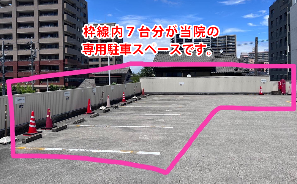 当院では、専用駐車場を7台完備しております。お車でもお気軽にご来院下さい。